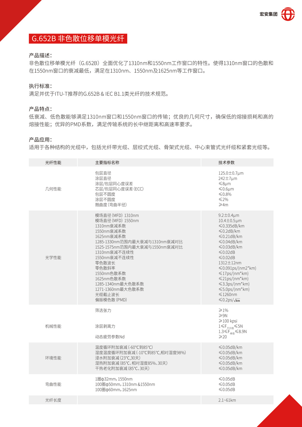 非色散位移单模光纤(G.652B)全面优化了1310nm和1550nm工作窗口的特性。使得1310nm窗口的色散和在1550nm窗口的衰减最低,满足在1310nm、1550nm及1625nm等工作窗口。