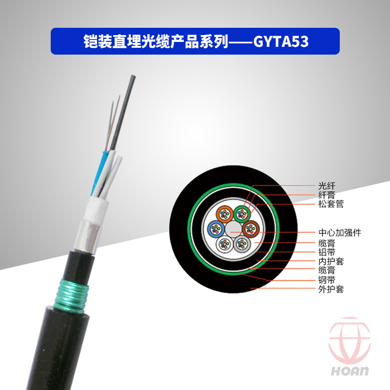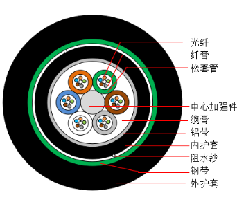 GYTA53 (松套层绞结构、金属加强件、缆膏填充、铝聚乙烯粘接内护套、钢聚乙烯粘接外护套)