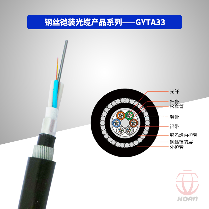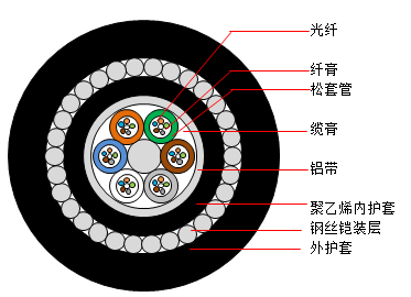 GYTA33 (松套层绞结构、金属加强件、缆膏填充、铝聚乙烯内护套、单细圆钢丝铠装层、聚乙烯外护套)