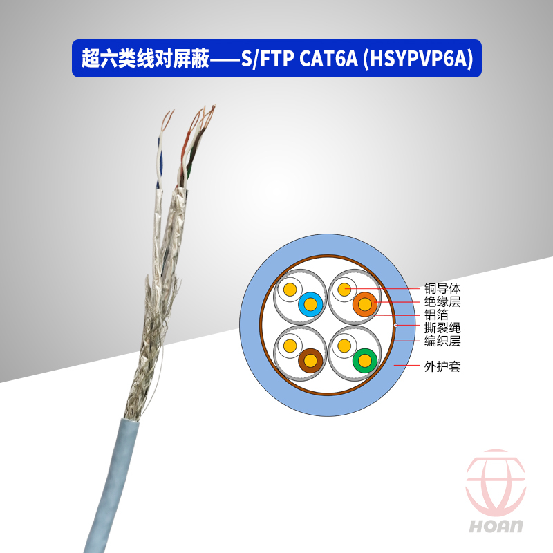S/FTP HSYPVP Cat6A(超6类、皮-泡-皮聚乙烯绝缘、线对铝箔屏蔽、镀锡铜编织屏蔽、聚氯乙烯外护)