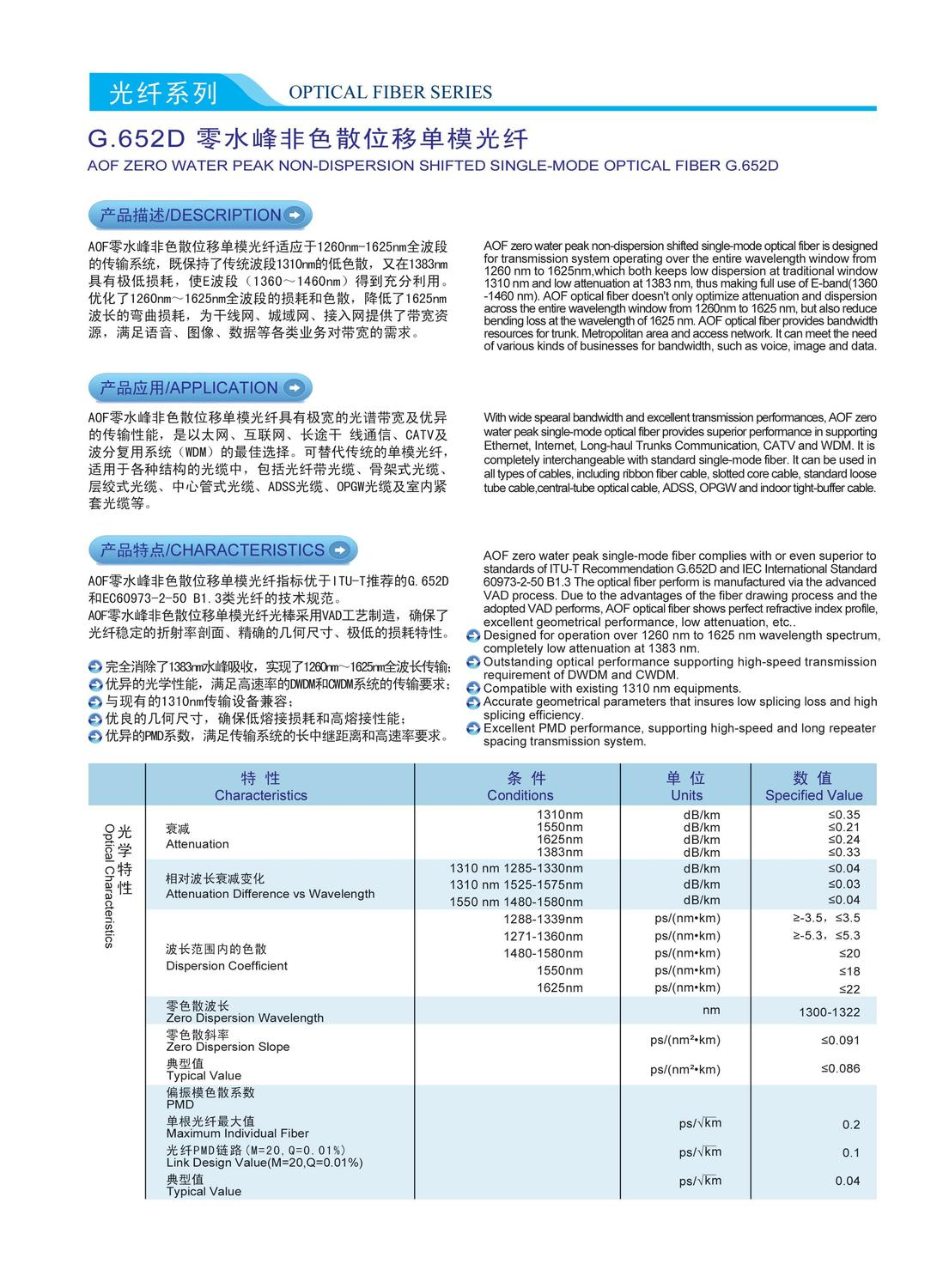AOF zero water peak non-dispersion shifted single-mode optical fiber is designedfor transmission system operating over the entire wavelength window from1260 nm to 1625nm,which both keeps low dispersion at traditional window1310 nm and low attenuation at 1383 nm, thus making full use of E-band(1360-1460 nm). AOF optical fber doesn't only optimize attenuation and dispersionacross the entire wavelength window from 1260nm to 1625 nm, but also reducebending loss at the wavelength of 1625 nm, AOF optical fiber provides bandwidthresources for trunk. Metropolitan area and access network. lt can meet the needofvarious kinds of businesses for bandwidth, such as voice, image and data.