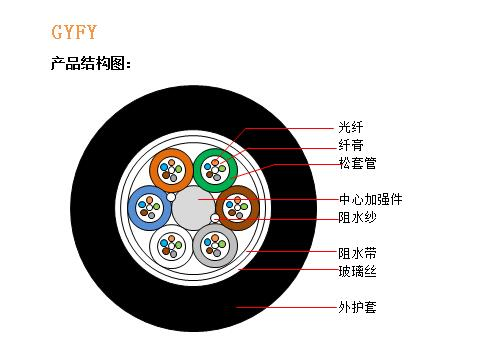 GYFY (松套层绞结构、非金属加强件、半干式阻水、玻璃丝增强件、聚乙烯外护套)