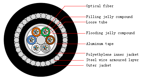 GYTA33 (loose layer twisted structure, metal reinforcement, cable paste filling, aluminum polyethylene inner sheath, single fine round steel wire armor layer, polyethylene outer sheath)