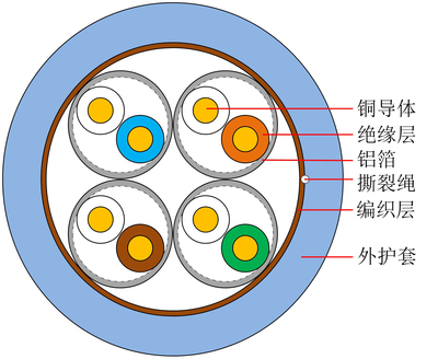 S/FTP HSYPVP Cat6A(超6类、皮-泡-皮聚乙烯绝缘、线对铝箔屏蔽、镀锡铜编织屏蔽、聚氯乙烯外护)